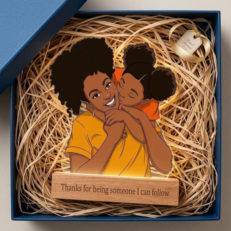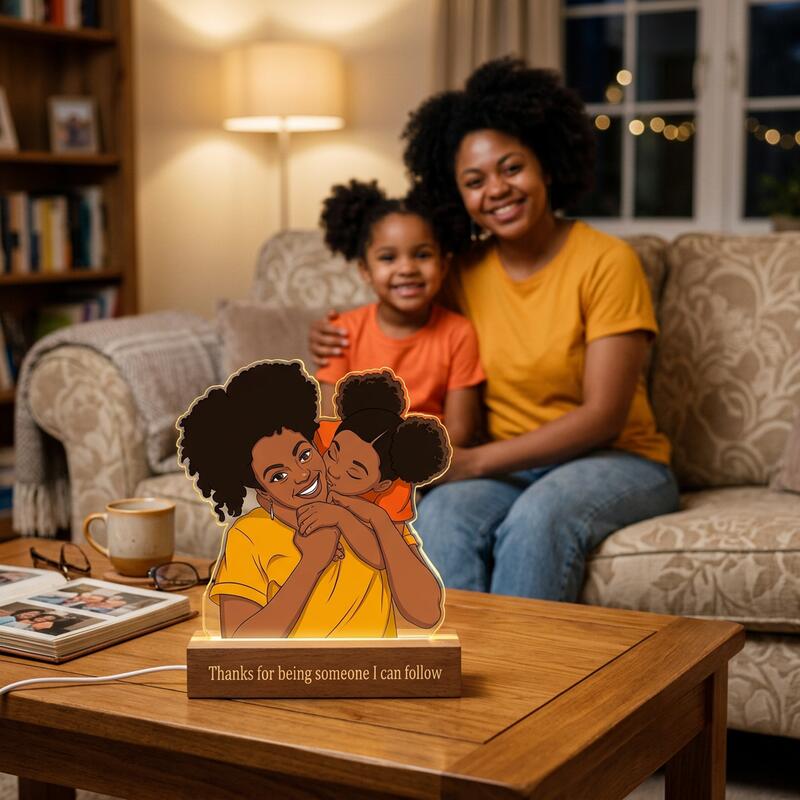This glowing acrylic lamp captures the moment when the daughter kisses her mother on the shoulder—the same afro, the same gentle eyes, a bond passed down through blood, an affection etched in their bones.