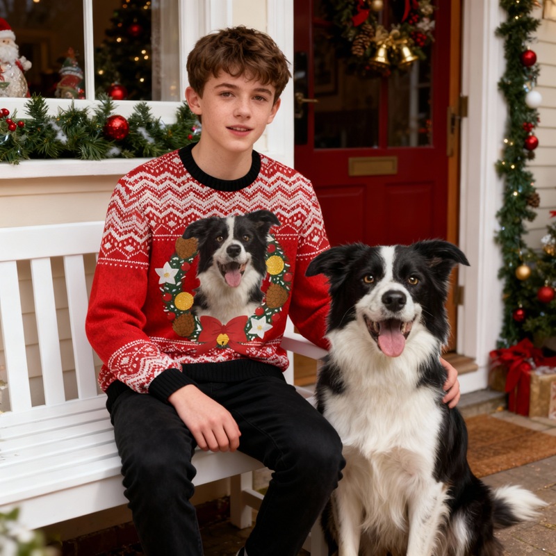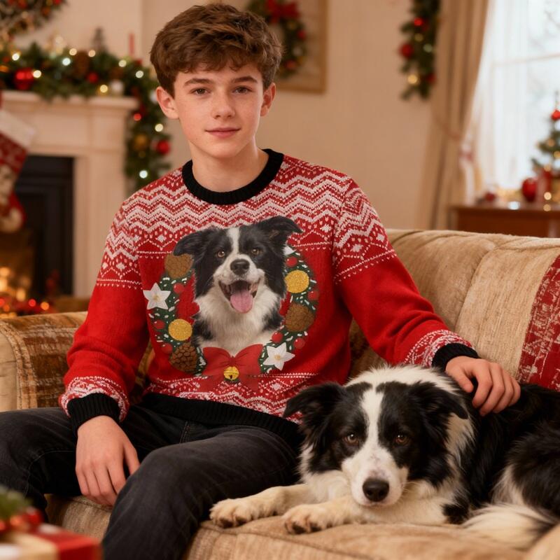 Personalized Kids Ugly Sweater Unisex Custom Pet Head Photo Wreath Design Perfect Gift for Christmas
