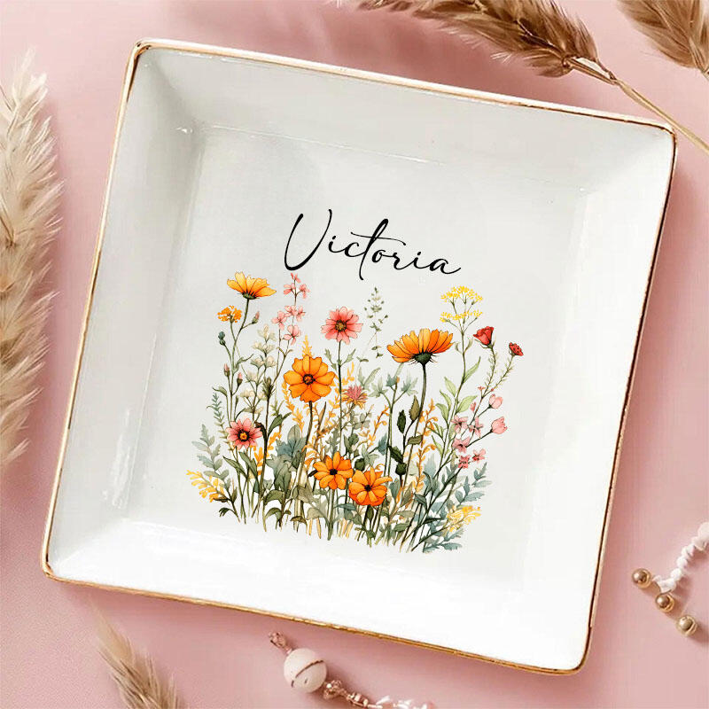 Personalized Name Jewelry Ring Dish with Colorful Flowers Pattern Beautiful Gift for Friend