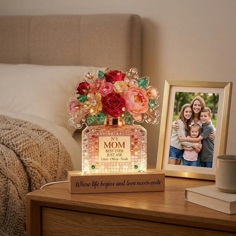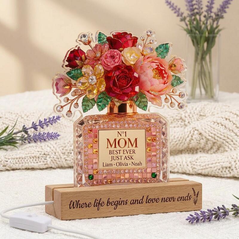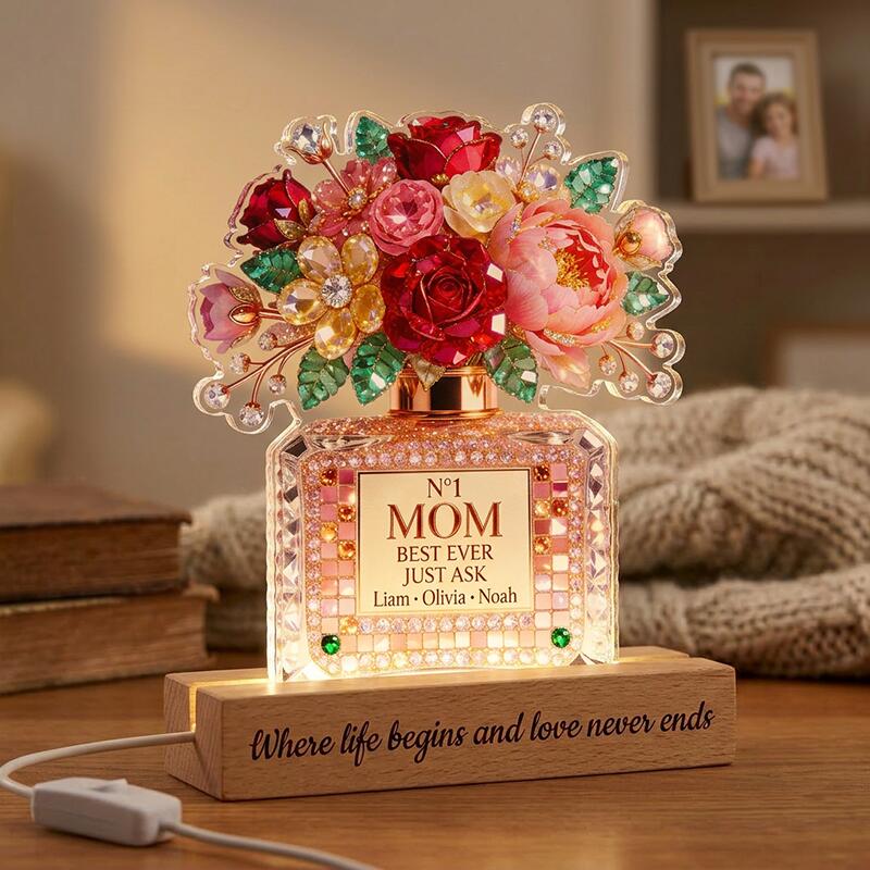 Designed as a sparkling perfume bottle overflowing with vibrant, jewel-toned blooms, this custom night light features a glamorous, gem-encrusted motif topped with a lush bouquet of roses, peonies, and golden floral accents. The elegant "N°1 MOM BEST EVER JUST ASK" message is centered on the bottle, with space to engrave the names of her kids, grandkids, or any loved ones, turning a simple decor piece into a timeless celebration of her unique role as the heart of your family. The soft, warm glow from the base casts a gentle, comforting light in any room, while the heartfelt phrase "Where life begins and love never ends" etched on the wooden stand adds a permanent, touching reminder of a mother’s endless love.