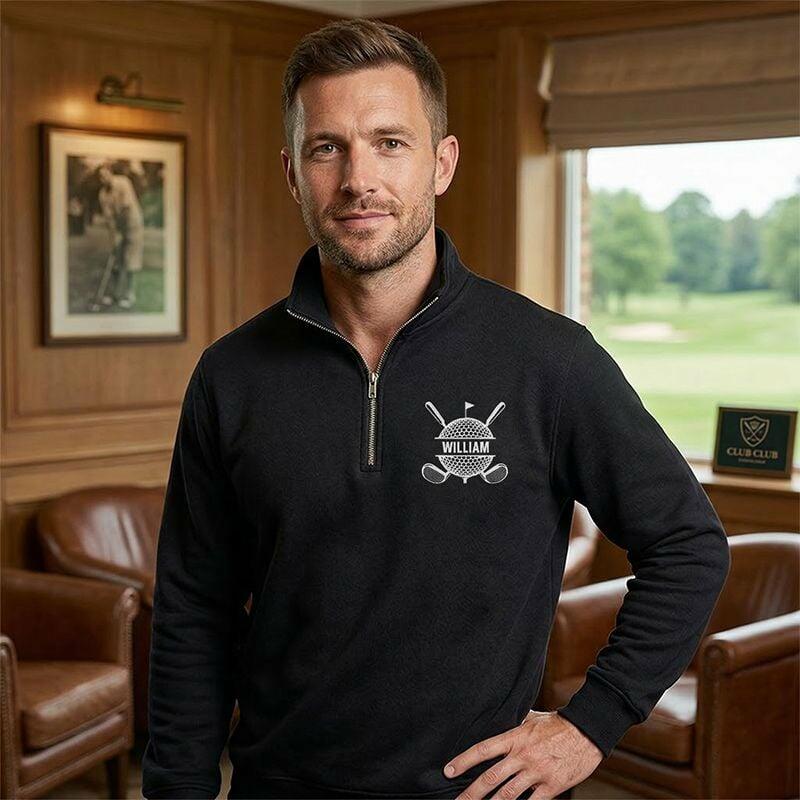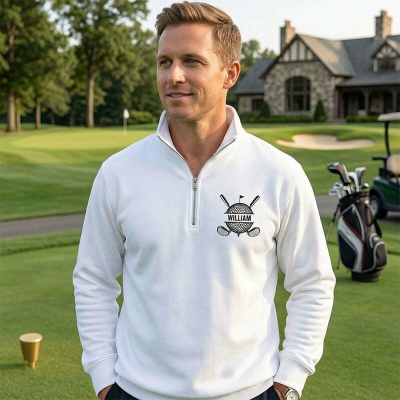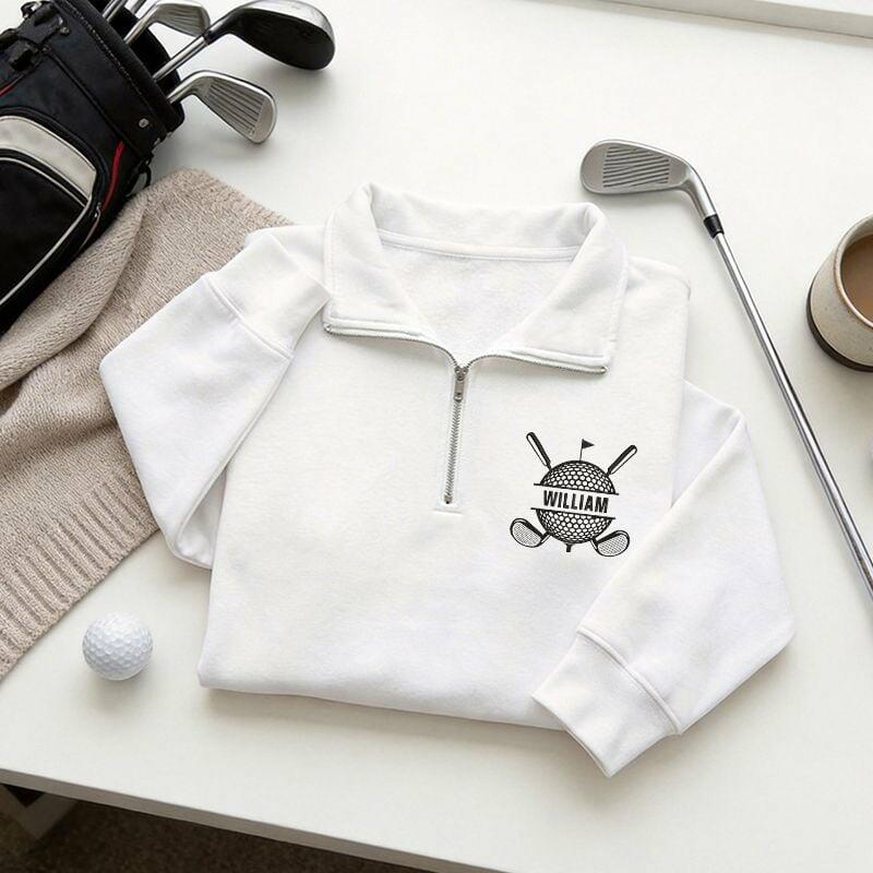 Personalized Quarter Zip Sweatshirt Embroidered Custom Name Golf Ball and Club Design Gift for Golf Lovers